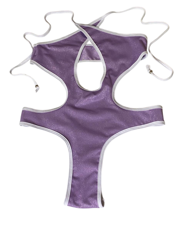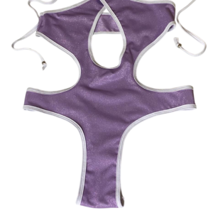 Diseñado para mujeres seguras, libres y poderosas. Su tono lila 💜 metalizado refleja la luz del sol con un brillo único, mientras que sus cortes estratégicos estilizan tu silueta y realzan cada curva.